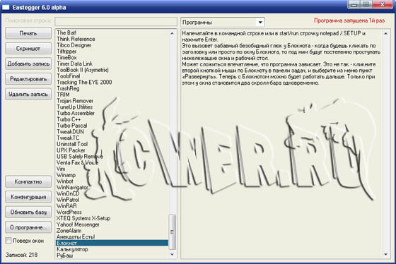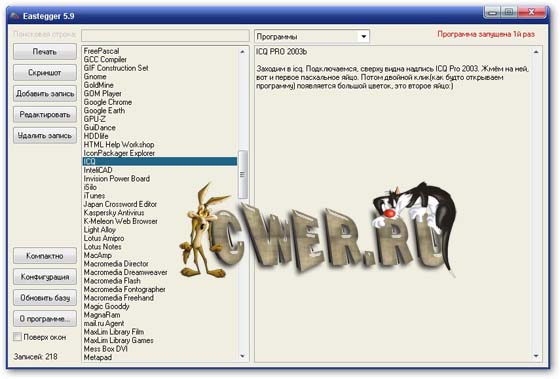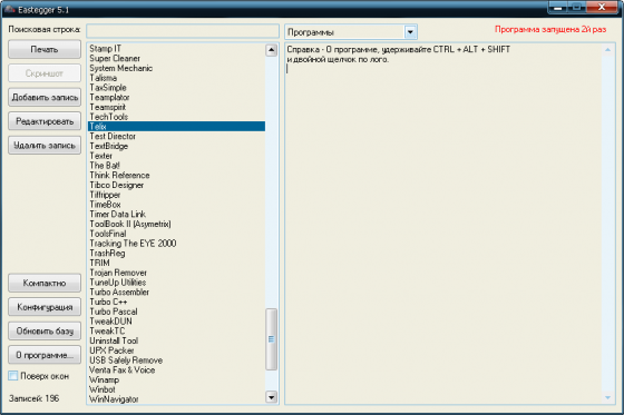 Известно, что у каждого есть свои секреты, это знают все. Вот и у каждой программы есть свои секреты. Eastegger здесь не исключение ;-). Эта программа содержит базу данных с описаниями пасхальных яиц (скрытых возможностей в программах), которые разработчики часто скрывают в своих творениях. В ней имеются секреты к большому числу программ, операционным системам, играм, мобильным телефонам, карманным компьютерам и с каждой новой версией этот список расширяется. База обновляется ежемесячно.