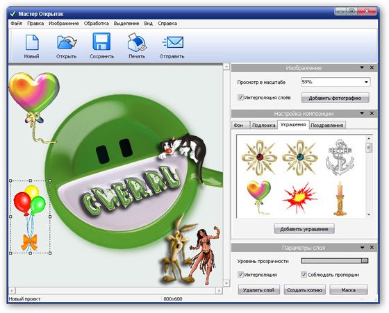 Мастер открыток - программа нового поколения для быстрого создания красивых поздравительных открыток. С помощью Мастера достаточно выбрать фон, украшения, написать текст поздравления и эффектная открытка готова. Вы можете вставить в проект любые фотографии, сделав открытку действительно уникальной. Программа также содержит большое количество текстов поздравлений в стихах к любому празднику.