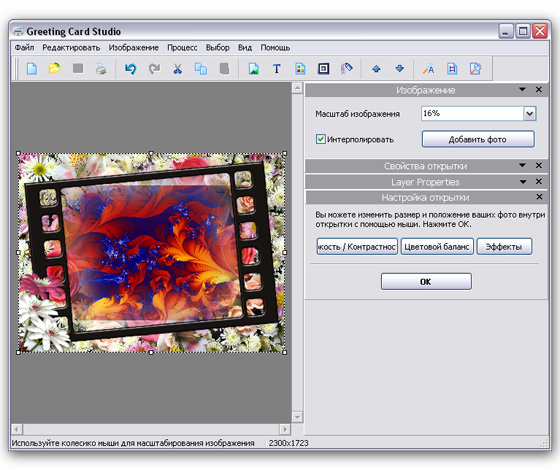 Greeting Card Studio - легкая в использовании программа для быстрого создания высококачественных поздравительных открыток. С помощью этой программы вы сможете создавать открытки, используя ваши собственные изображения, фон и текст. Программа содержит в себе готовые профессиональные шаблоны, предназначенные для быстрого создания открытки. Вам нужно всего-лишь выбрать бумагу, нужный дизайн, открыть понравившийся шаблон, отредактировать открытку и распечать ее на принтере. Также вы сможете создать собственный уникальный дизайн и наложить на картинки эффекты, рамки, границы, сделать фон и наложить различные изображения на вашу открытку. При этом, вам дается возможность масштабирования и переворачивания фотографий как вы пожелаете. Готовый результат вы сможете распечать на принтере или сохранить в один из графических форматов.