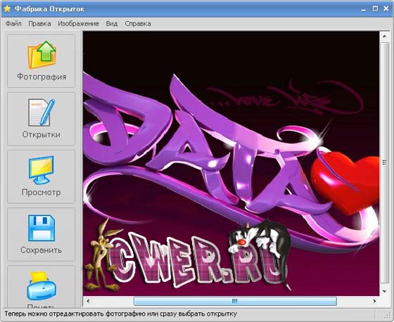 Фабрика Открыток - новая версия программы для быстрого создания стильных поздравительных открыток. Теперь всего за пару минут можно подготовить открытку профессионального качества с вашей фотографией. В комплект программы входит более полусотни ярких и оригинальных шаблонов открыток и календарей. Фабрика Открыток позволяет также накладывать рамки и применять специальные эффекты.
