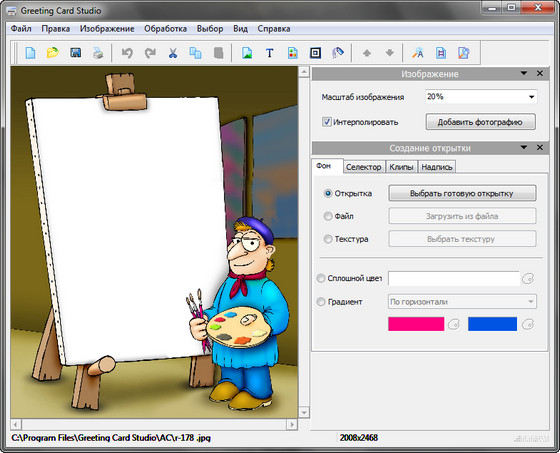 Greeting Card Studio - легкая в использовании программа для быстрого создания высококачественных поздравительных открыток. С помощью этой программы вы сможете создавать открытки, используя ваши собственные изображения, фон и текст. Программа содержит в себе готовые профессиональные шаблоны, предназначенные для быстрого создания открытки.