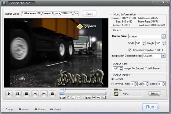Video to GIF - профессиональный многофункциональный видео-конвертер с дружественным и простым интерфейсом. С Video to GIF Converter вы можете легко и быстро создавать высококачественные анимированные GIF файлы из видео. Video to GIF поддерживает большинство популярных видео форматов, таких как AVI, MPEG, MP4, DivX, WMV, DVD (VOB), RMVB и т.д.