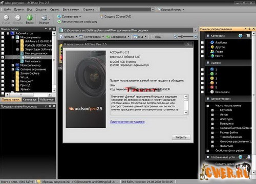 ACDSee Pro - профессиональная программа для работы с цифровыми фотографиями, которая обладает расширенным набором функций, рассчитанных на профессиональных фотографов. Поддерживает более 100 форматов графических файлов, позволяет работать с RAW-изображениями, автоматически сортировать фотографии по параметрам, полученным из цифровых фотокамер, содержит эффективный визуальный метод добавления к изображениям метатегов и быструю пакетную обработку большого количества картинок, в том числе и в RAW формате. Кроме того, здесь присутствуют инструменты для независимого регулирования цветовых каналов, исправления артефактов фотографий, появляющихся из-за погрешностей оптики, добавления "водяных знаков", работы с IPTC-метаданными, имеется возможность архивирования графических коллекций в ZIP-файлы, запись на CD или DVD и многое другое.