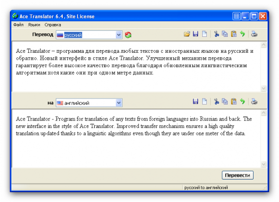 Ace Translator – программа для перевода любых текстов с иностранных языков на русский и обратно. Новый интерфейс в стиле Ace Translator. Улучшенный механизм перевода гарантирует более высокое качество перевода благодаря обновленным лингвистическим алгоритмам хотя какие они при одном метре данных.