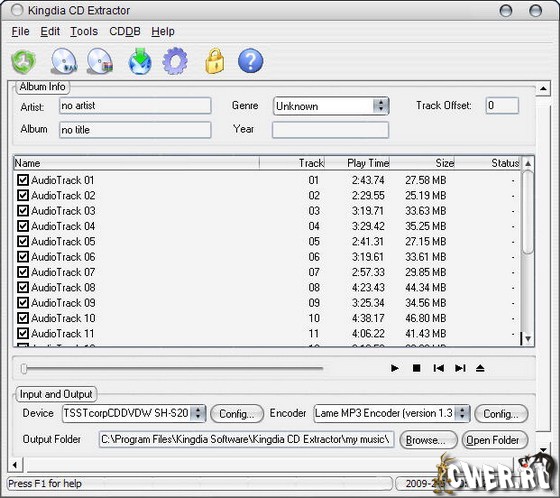 Kingdia CD Extractor является граббером аудио CD и аудио конвертером. Область применения: перенос цифровых аудио треков непосредственно с CD дисков в аудио форматы MP3, WAV, WMA, OGG, VQF и APE и другие форматы. Возможность конвертирования между форматами MP3, WAV, WMA, OGG, VQF , APE. Поддержка переконвертирования с новыми параметрами, поддержка MP2, RIFF-WAV форматов, поиск информации и авто заполнение тэгов по CDDB базе через Интернет, создание и редактирование ID3 тэгов, создание собственной CDDB базы коллекции, встроен проигрыватель аудио файлов, экспорт M3U и PLS плейлистов, простой и удобный интерфейс, высокая скорость и высокое качество.