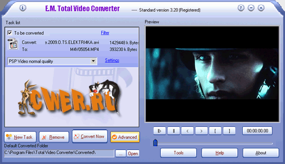 Total Video Converter - очень мощная программа, которая позволяет конвертировать любые видеофайлы в форматы 3gp (формат мобильных телефонов и наладонников), mp4, psp, iPod, swf, flv, DVD, VCD.
