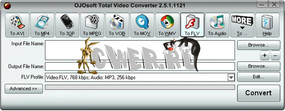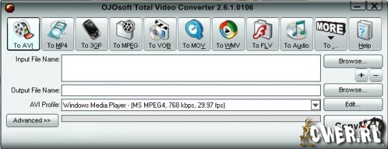 OJOsoft Total Video Converter - очень мощная программа, которая позволяет конвертировать любые видеофайлы в форматы 3gp (формат мобильных телефонов и наладонников), mp4, psp, iPod, swf, flv, DVD, VCD.