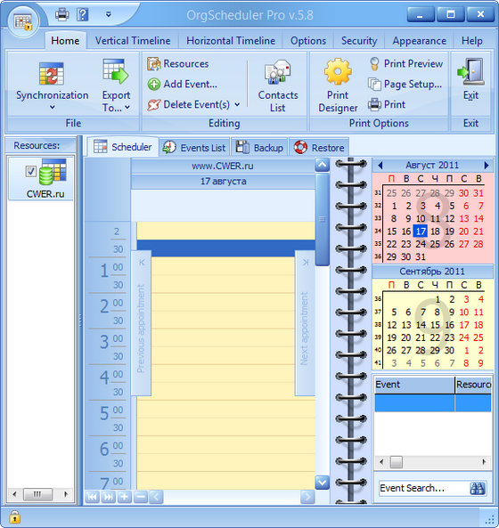 Универсальный календарь и органайзер. OrgScheduler поддерживает установку «скинов» и предоставляет пользователю возможность самостоятельно настроить систему «горячих» клавиш и опций, для увеличения удобства работы с приложением. Одним из преимуществ OrgScheduler является уникальный порядок отображения запланированных действий – одновременно показываются две календарные сетки, каждая из которых содержит тематически отсортированную информацию: работа, частная жизнь и др. Каждый из созданных подразделов снабжается определенной иконкой и заголовком, что позволяет очень быстро сориентироваться и отыскать необходимую информацию.