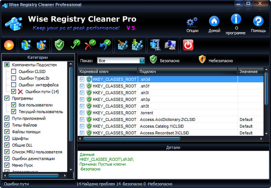 Wise Registry Cleaner - бесплатная версия безопасной утилиты для чистки реестра Windows. Программа сканирует реестр и ищет в нем некорректную и устаревшую информацию, после удаления которой операционная система работает более быстро. После того, как программа проанализирует проблемы вашей системы, вы можете сами просмотреть каждую найденную неполадку и посмотреть ее детальное описание. Все изменения, внесенные программой в реестр, могут быть отменены за два клика мышью. Также стоит отметить, что интерфейс программы переведен на множество языков, включая русский язык.