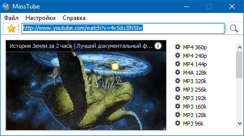 MassTube Plus — замечательная и простая в использовании утилита для быстрого и легкого скачивания видео с YouTube за пару кликов. Достаточно в строку поиска вставить ссылку на интересующий Вас видеоролик и нажать поиск, после чего программа предоставит список форматов и разрешений, в которых можно быстро скачать данный клип.