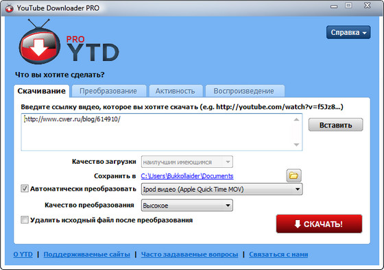 YouTube Downloader PRO – программа, позволяющая легко скачать на жесткий диск в подходящем формате любое понравившиеся вам видео с сайта YouTube, Facebook, Google Video, Yahoo Video и не только. Программа проста в использовании, просто нужно указать URL для видео, которое вы хотите скачать и нажать кнопку СКАЧАТЬ! YouTube Downloader PRO также позволяет конвертировать загруженное видео для Ipod, Iphone, PSP, Windows Media, XVid и MP3