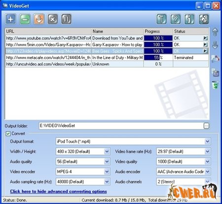 Многие из этих веб-сайтов держат видео в FLV формате, и большинство людей не знает как проигрывать эти файлы VideoGet также позволит вам конвертировать все видео в множество популярных форматов для более комфортного проигрывания VideoGet поддерживает AVI, MPEG1, MPEG2, WMV, FLV, MP4, 3GP, MP3 форматы, так что вы имеете возможность не только посмотреть видео на своем компьютере, но и переписать его на свой iPod, мобильный телефон или любой другой портативный прибор. Кроме того вы самостоятельно можете задавать настройки конвертации.