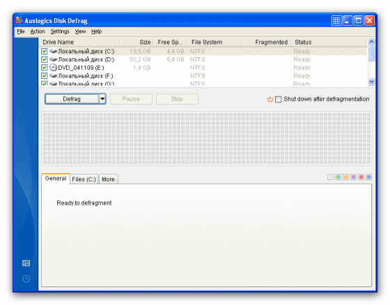 Auslogics Disk Defrag - компактный дефрагментатор, который имеет удобное управление, предоставляет детальную информацию о текущем состоянии файловой системы, а, кроме того, работает достаточно быстро. Возможности программы Auslogics Disk Defrag: быстрая и надежная дефрагментация диска, упорядочивание структуры кластеров и файловой системы, удобная и функциональная карта диска, отображающая процесс дефрагментации в реальном времени, простое и наглядное управление программой, мощная система генерации отчетов, создающая подробные и понятные отчеты о результатах работы программы, минимальный объем потребляемых ресурсов компьютера.