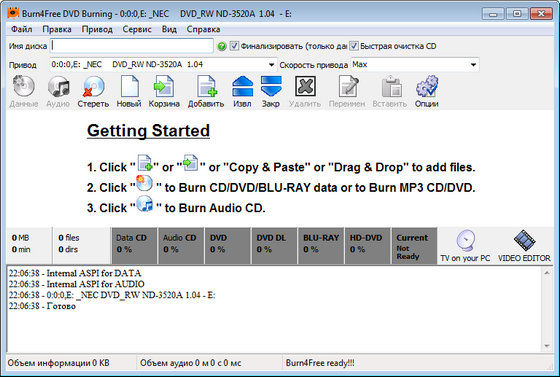 Burn4Free - программа для записи CD и DVD дисков. Сразу стоит сказать, что Burn4Free поддерживает работу более чем с 1900 различными записывающими CD/DVD приводами. Запись осуществляется на следующих форматах дисков: CD-R/CD-RW/DVD-R/DVD+R/DVD-RW/DVD+RW/DVD-RAM. Предусмотрена возможность прожигать ISO образы (эта функция выделена отдельно; запись ISO образа осуществляется несколькими кликами мыши). Кроме того, Burn4Free поддерживает работу с различными музыкальными форматами: WAV, FLAC, WavPack, WMA, MP3, MP2, MP1 OGG и CDA, что позволяет использовать эту программу для создания музыкальных дисков. В целом Burn4Free выглядит весьма привлекательно на фоне подобных программ и обладает оригинальными возможностями.