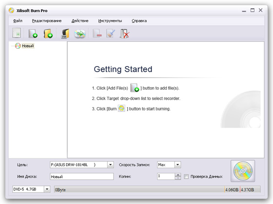 Burn4Free - это программа для записи CD и DVD дисков. Сразу стоит сказать, что Burn4Free поддерживает работу более чем с 1900 различными записывающими CD/DVD приводами. Запись осуществляется на следующих форматах дисков: CD-R/CD-RW/DVD-R/DVD+R/DVD-RW/DVD+RW/DVD-RAM. Предусмотрена возможность прожигать ISO образы (эта функция выделена отдельно; запись ISO образа осуществляется несколькими кликами мыши). Кроме того, Burn4Free поддерживает работу с различными музыкальными форматами: WAV, FLAC, WavPack, WMA, MP3, MP2, MP1 OGG и CDA, что позволяет использовать эту программу для создания музыкальных дисков. В целом Burn4Free выглядит весьма привлекательно на фоне подобных программ и обладает оригинальными возможностями.