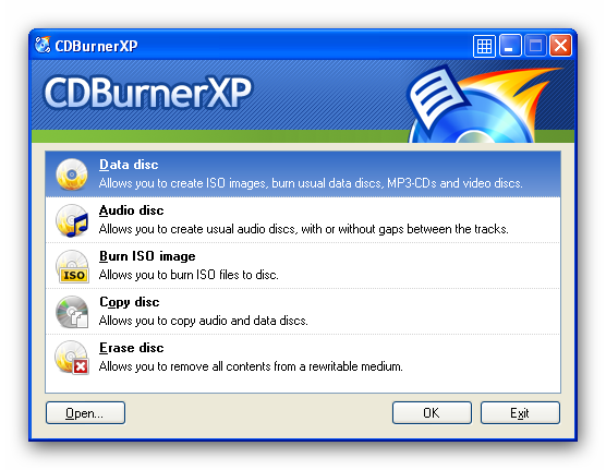 CDBurnerXP - программа для записи CD и DVD, включая Blu-Ray и HD-DVD. Пишет данные с жесткого диска и из ISO имиджей, записывает CD с данными и аудио-CD. Кроме этого, позволяет создавать загрузочные диски, переписывать аудиоCD на жесткий диск "на лету" в файлы MP3, OGG, WMA, WAV, а также сохранять образы CD в виде ISO-файлов.