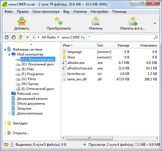 WinRAR - один из самых известных архиваторов. То, что он поддерживает архивацию в формате RAR, это, вероятно, обьяснять не надо. Кроме того, программа умеет работать с архивами ZIP, CAB, ARJ, LZH, TAR, GZ, ACE 2.0, BZIP, JAR, UUE, GZIP, BZIP2 и 7-Zip, при этом она обладает многочисленными очень полезными возможностями - шифрование, поддержка непрерывных (solid) архивов, в которых степень сжатия может быть на 10 – 50% больше, чем при обычных методах сжатия, специальный алгоритм для сжатия мультимедийных файлов, поддержка многотомных архивов и многим другим.