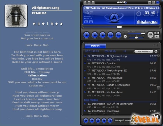 Один из лучших аудио проигрывателей. Основные функциональные возможности: проигрывание музыкальных файлов в моно и стерео режимах (поддерживает свыше 20 форматов, среди них MP1-3, WAV и другие), CD-аудио дисков, минибраузер для работы с аудио потоком из Интернета, богатый гардероб скинов и плагинов, выбор файлов из PlayList, удобный эквалайзер.