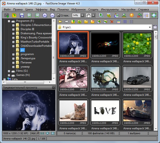 FastStone Image Viewer - вьювер, редактор и конвертор графических файлов. Поддерживает все популярные форматы графики, включая JPEG, JPEG 2000, GIF, PNG, PCX, TIFF, WMF, BMP, ICO, RAW и TGA. Обладает простым и удобными интерфейсом, сочетая его с большим количеством полезных возможностей. Поддерживается пакетное изменение размеров и переименование картинок, удаление ненужных фрагментов, подгонка и изменение цветов, установка водяных знаков и т.д. и т.п. Имеется возможность создавать слайдшоу с более чем 150 эффектами перехода и фоновой музыкой, присутствует различные графические эффекты, ZOOM, полноэкранный режим, поддержка работы со сканером и т.д. Кроме всего этого, программа умеет делать скриншоты экрана, причем как экрана целиком, так и любой его части.