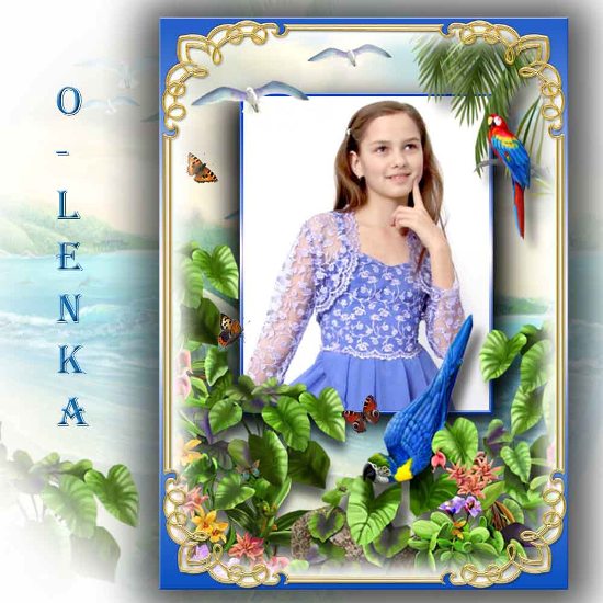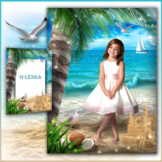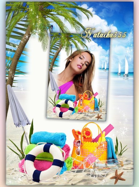Многослойная летняя фоторамка на фоне пляжа и пальм для оформления фото с морского отдыха.