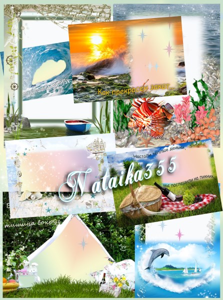 Сборка тематических фоторамок с отдыха на рыбалке, в лесу с палаткой, на пикнике и морском берегу.
