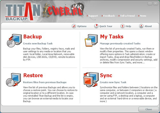 Titan Backup - программа для автоматического создания резервных копий цифровых фотографий, электронной почты, важных документов, баз данных, электронных книг и многого другого. Данная программа способна автоматически создавать запасные копии Ваших важных файлов и документов, фактически на любом типе носителей данных, включая CD/DVD-RW, сменные устройства, сетевые диски и удаленные FTP серверы. Средство разработано для безопасного резервирования ваших документов. Позволяет создавать резервную копию с возможностью сохранения на виртуальных дисках, CD/DVD, сетевых дисках, FTP, дискетах. Чтобы гарантировать полную безопасность ваших конфиденциальных файлов, программа использует мощную 256-битную AES-кодировку. Имеет простой и интуитивно понятный интерфейс, а также удобное переключение между задачами.