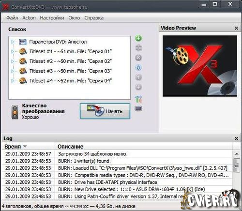 Вышла новая версия ConvertXtoDVD знакомой раньше нам под названием DivXtoDVD. Эта версия объединила в себе, лучшие качества VSO Software, а так же добавлено много новых возможностей. VSO ConvertXtoDVD - позволяет Вам преобразовывать и затем прожигать Ваши видео файлы, которые будут совместимы с любым проигрывателем DVD. ConvertXtoDVD - поддерживает множество файлов, XVid, MPEG 1/2/4, VOB, MOV, и теперь WMV 3, форматы HD и т.д...
