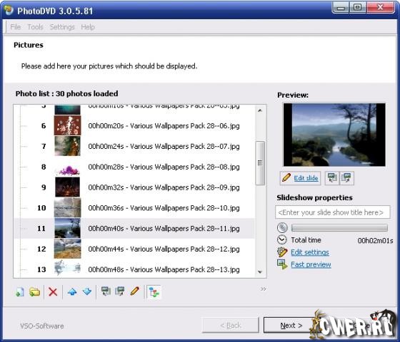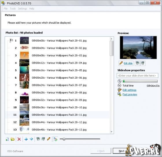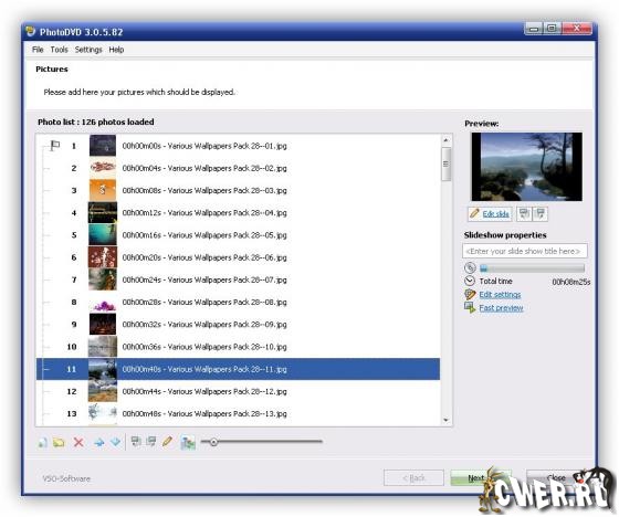VSO PhotoDVD - программа для создания анимированных слайд-шоу для записи на DVD — очень проста в использовании и при этом обладающая широкими возможностями. Позволяет использовать для создания слайд-шоу файлы в наиболее популярных форматах - JPG, GIF, BMP, ANI, PCX, EMF, WMF и т.д., добавляя в качестве сопутствующего саундтрека файлы форматов MP3, WMA, OGG, MPC, WAV и APE. Имеется поддержка вывода данных в форматах FullScreen (4:3) и Widescreen (16:9).