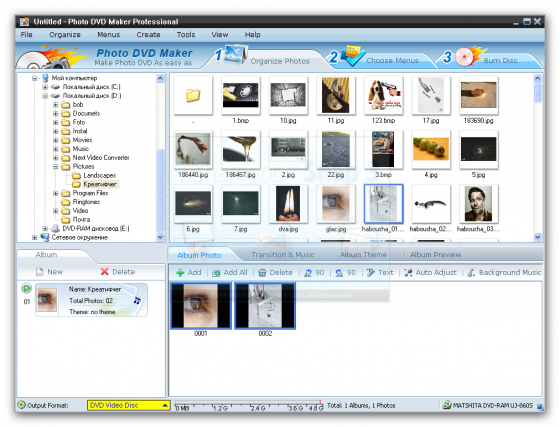 Photo DVD Maker является мощным и удобным в работе приложением для создания ошеломляющих слайдшоу. Являетесь ли вы экспертом или новичком, это не имеет значения, программа проста и удобна в обращении. Особенности: создание непрерывного слайдшоу из фотографий или видео роликов неограниченного колличества, наложение и соединение со звуковыми файлами (фоновая музыка), тектами, создание титров и субтитров, наложение эффектов перехода с выбором из более 150 эффекта перехода, создание проекта и прожиг в DVD, VCD или SVCD форматах для последующего просмотра на любом домашнем проигрывателе.