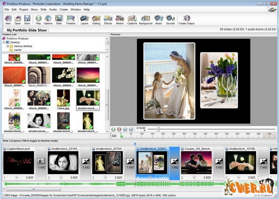 Программа, которая является ведущей в области профессионального создания демонстрации слайдов. ProShow Producer - очень простая в применении (поддерживается drag-and-drop), обладает множеством полезных возможностей (более 280 эффектов), начиная с автоматической синхронизации времени проигрывания музыкального сопровождения со временем показа слайд-шоу до очень удобной записи на DVD, SVCD, VCD и EXE в NTSC или PAL.