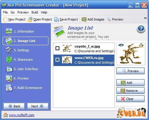 С помощью программы Nufsoft Ace Pro Screensaver Creator Вы можете создать профессиональные заставки, делать оживляемые демонстрации слайдов легко всего в нескольких шагах. Добавляйте эффект воды, погоды, звуковые эффекты, и оживляемые объекты. Более чем 100 гладких и настраиваемых эффектов перехода изображения.
