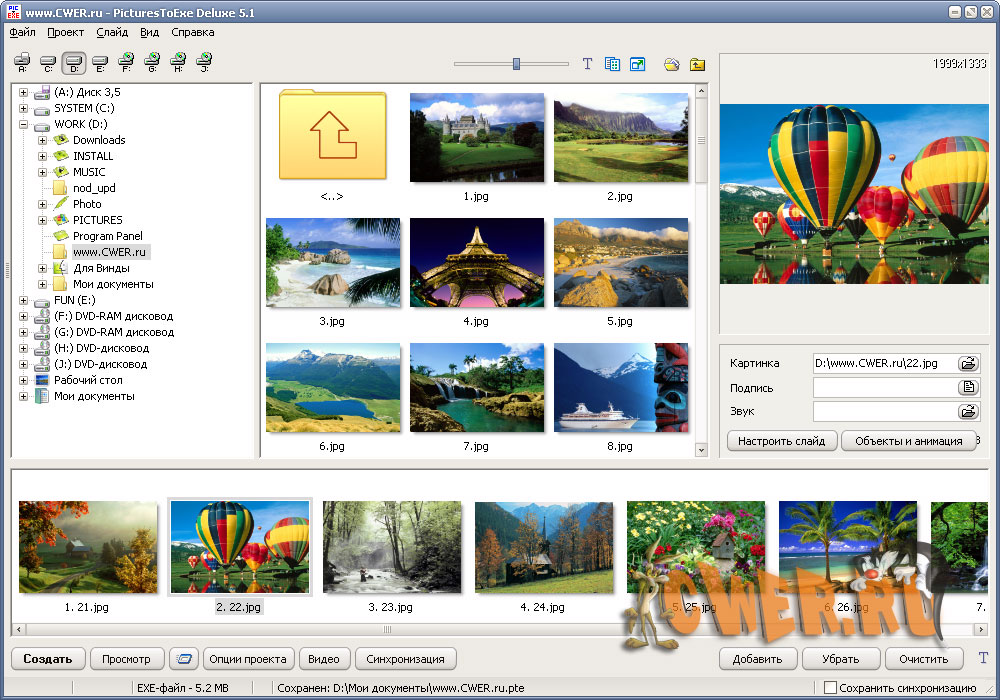- Сохранять слайд-шоу как скринсейвер, видеоролик WMV или EXE- файл