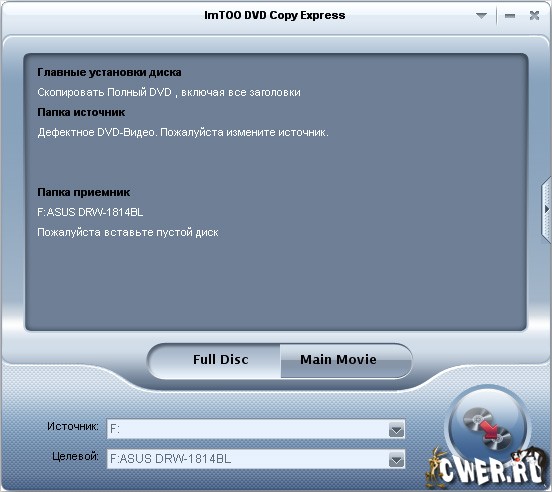 ImTOO DVD Copy Express - простая в использовании и быстрая утилита для копирования видео с дисков DVD. Предоставляет пользователю наилучший способ для быстрого копирования DVD-фильмов с высоким качеством. Программа может скопировать диск один к одному или с легкостью сжать DVD-9 (двухслойный диск) до размера DVD-5. Возможности программы также включают в себя удаление меню диска, выбор субтитров, аудиодорожек, копирование отдельно основного фильма для создания собственного DVD.