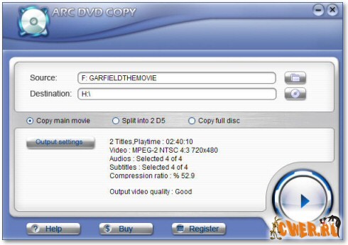 Arc DVD Copy - простой и быстрый инструмент для копирования видео DVD в том числе и защищенных. Подойдёт как начинающим пользователям, так и продвинутым. Скопирует DVD-фильм за 20-40 минут! Поддерживает двуслойные диски, возможность редактирования меню, шифрования Ваших проектов и многое, многое другое!