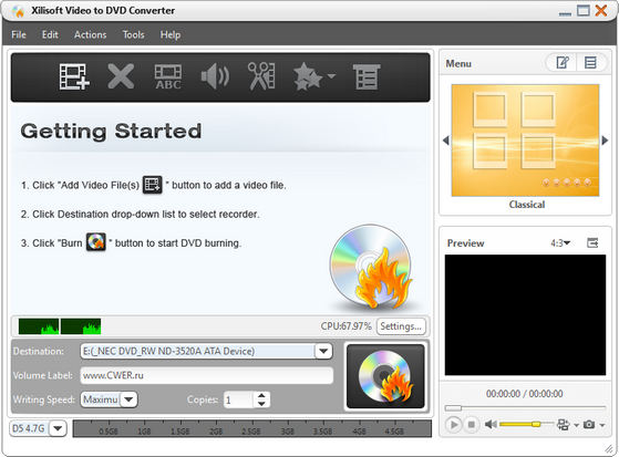Xilisoft Video to DVD Converter предлагает идеальное решение для преобразования всей Вашей библиотеки видео файлов на DVD. Вы можете конвертировать обычные и высокой четкости (HD) видео форматы файлов (MP4, MKV, AVI, DivX, Xvid, HD видеокамеры видео (M2TS, МТС, TS), MPG, MPEG, QuickTime видео ( MOV, QT), DV, VOB, Real Video (RM, RMVB), WMV, H.264/AVC, ASF, DAT, FLV, 3GP) на DVD фильмы, записать их на DVD, и смотреть их на DVD проигрывателе. Этот видеоконвертер может также создавать ISO файлы и папки DVD для видео файлов.