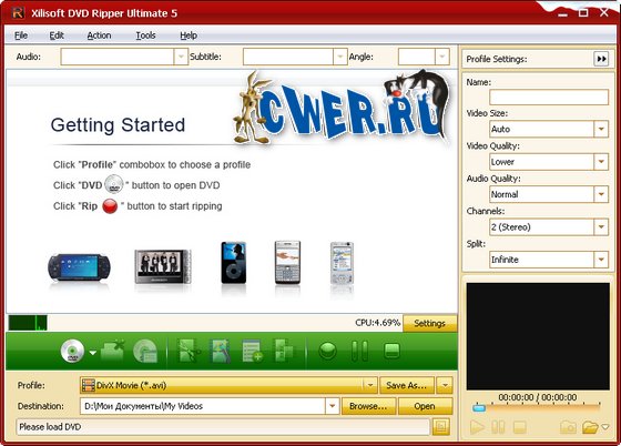Xilisoft DVD Ripper Ultimate - мощная и удобная в использовании программа для копирования DVD-дисков с возможность конвертирования содержимого в соответствующие аудио и видео файлы типа AVI, MPEG, WMV, DivX, MP4, H.264, RM, MOV, M4V, XviD, 3GP, MP3, WMA, WAV, RA, M4A, AAC, AC3, OGG и т.д. Утилита способна создавать файлы, совместимые с iPod, iPhone, PSP, Apple TV и прочими портативными устройствами. Имеются опции конвертирования сегментов клипа, изменения размеров, наложения эффектов, добавления логотипов, предпросмотра результатов. Присутствует пакетная обработка файлов, получение информации из Интернет-баз и многие другие возможности.
