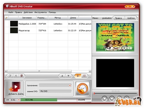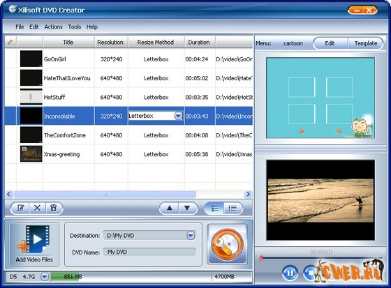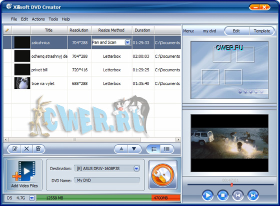 Xilisoft DVD Creator - программа для создания и записи (прожига) DVD с простым и удобным русским интерфейсом. Основные возможности, это - создание DVD с полноценными меню и субтитрами из AVI, MPEG, WMV, DV, DivX, Xvid, VOB, 3GP, 3G2, MP4 и других видеофайлов; выбор из имеющихся преднастроек или собственная настройка параметров видео - битрейда, фреймрейда, качества и других параметров DVD, поддержка NTSC и PAL, поддержка соотношений картинки 4:3 и 16:9, предварительный просмотр результата, наконец, прожиг созданного проекта на DVD. Возможно создание и запись на DVD ISО-образа. Поддерживаются DVD-R, DVD+R, DVD-RW, DVD+RW.