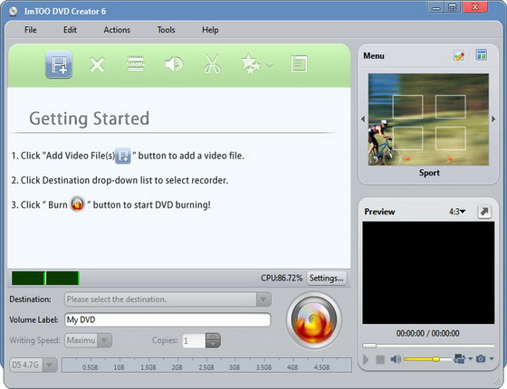 ImTOO DVD Creator - быстрый и легкий для использования конвертер DVD. Он поддерживает и конвертирует почти все популярные видео-форматы в DVD, и записывает на DVD, поэтому вы сможете посмотреть их на домашнем проигрывателе DVD. Обеспечивает много красивых меню для вашего DVD, поддерживает DVD-R, DVD+R, DVD-RW и DVD+RW. Легок в использовании, для того чтобы сделать свой DVD достаточно несколько нажатий на клавиши! Поддерживает множество видео-форматов, включая AVI, mpeg, WMV, DivX, Xvid, VOB, 3GP, MP4, MKV, TS, MOV, МТС, m2ts и так далее. Позволяет вам переключатся между NTSC или PAL, записывать диски DVD, сохранять в ISO.