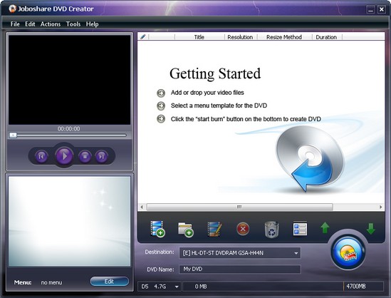 Joboshare DVD Creator - профессиональная программа для создания и записи DVD из видео файлов форматов AVI, MPEG, DAT, MPG, WMV, ASF, MP4, 3GP, VOB с возможностью редактирования и создания меню. Позволяет определить NTSC или PAL, настроить соотношение видео 4:3 или 16:9, записывать ISO файлы и папки DVD с фильмом. Поддерживает множество форматов DVD, включая DVD-R, DVD+R, DVD-RW, DVD+RW, DVD-5, и DVD-9. Имеет простой и удобный интерфейс.