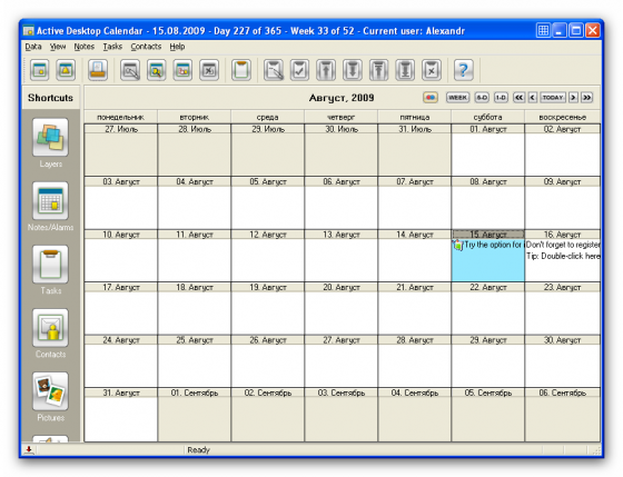 Active Desktop Calendar - красивый и функциональный интерактивный календарь, который показывает на рабочем столе, поверх обоев активный календарь, Ваши заметки и задания, которые Вы запланировали на тот или иной день. Также есть напоминания для Ваших событий и заставка. Календарь может быть показан в традиционным виде или в виде значков. Предусмотрена возможность создания слоев для разных событий и подключение нескольких компьютеров к общему файлу.