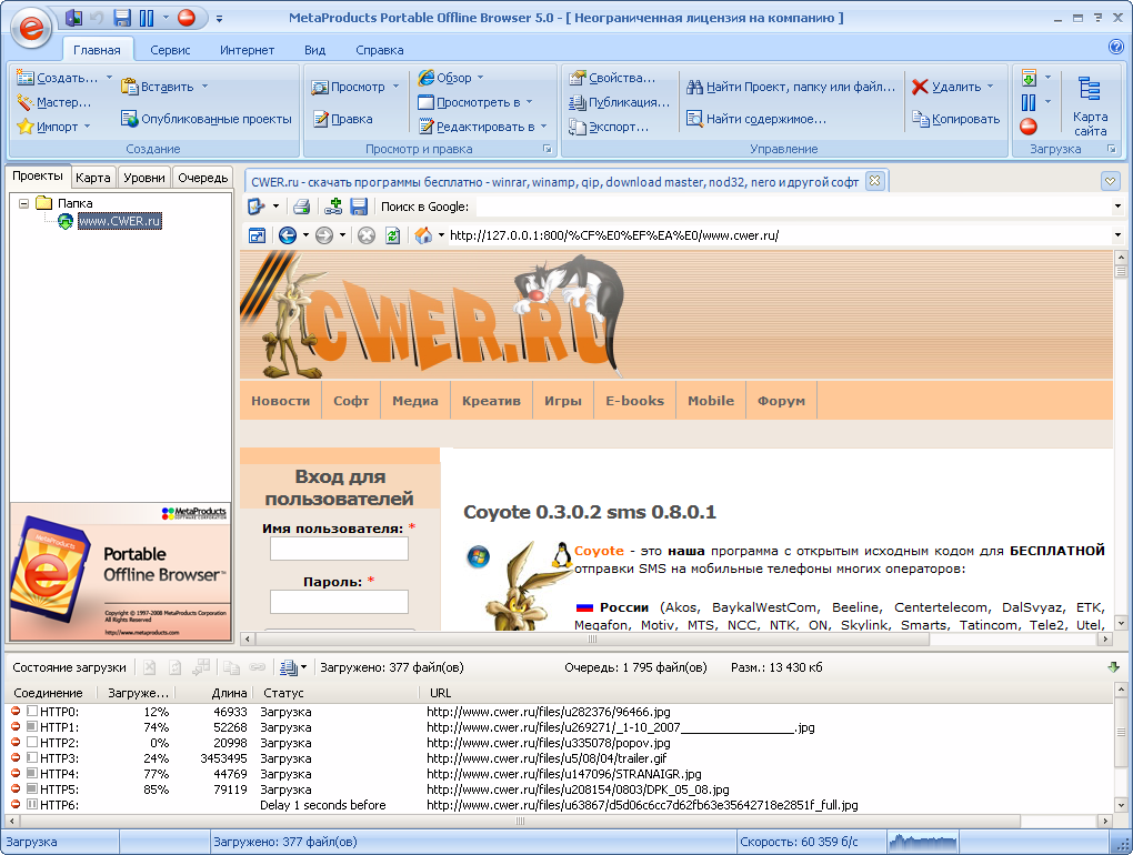 MetaProducts Offline Explorer - оффлайн браузер, поддерживающий работу как с обычными Web сайтами, так и с FTP, защищенными (HTTPS) серверами, потоковыми видео/аудио приложениями (MMS, RTSP в профессиональной версии). Встроенные средства обеспечивают комфортную работу с закачанными узлами. Есть планировщик, экспорт, импорт, встроенный браузер и много дополнительных инструментов.Мощные средства настройки позволяют закачивать даже самые сложные сайты. Производится обработка скриптов, классов Java, Flash апплетов, PDF, ASX, RAM, XML/XSL, CSS, TOC, M3U, RPM, AAM файлов.