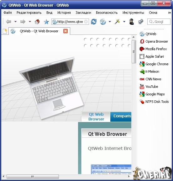 QtWeb Internet Browser - не требующий установки, интернет-браузер, который можно запускать со сменных носителей, позволяющий абсолютно анонимно просматривать web-страницы, поскольку он не оставляет абсолютно никаких следов на компьютере и записей в реестре. Не смотря на это, браузер поддерживает работу с закладками, cookies, смену скинов, всевозможные настройки панелей инструментов и рабочего пространства и многое другое.