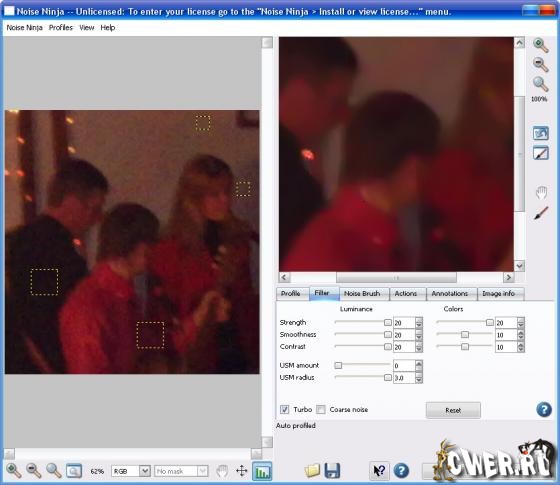 Noise Ninja - программа для подавления цифрового шума. Она является лидером в своем классе и по получаемым результам с ней могут сравниться лишь Neat Image и Grain Surgery. Эффективное и производительное решение для устранения зерна и помех с цифровых фотографий или сканера. Эффект применения Noise Ninja воистину волшебен: шум во всех своих проявлениях ослабляется или даже исчезает без следа, в то время как потеря деталей и насыщенности некоторых цветов сведена практически к минимуму. Работа Noise Ninja основана на профилях, которые создаются не только для различных камер, но и для разных параметров съемки этими камерами. Программа имеет функцию автоматического профилирования камеры как на основе обрабатываемой фотографии, так и на основе снимков специальной мишени, оптимизированный для создания шумовых профилей. В момент загрузки изображения для обработки, Noise Ninja считывает EXIF информацию из файла и на основании параметров съемки автоматически подбирает и подгружает наиболее подходящий профиль для подавления цифрового шума.