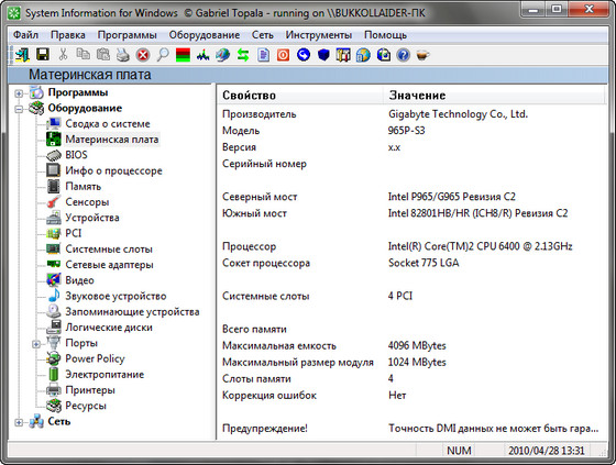 Компактная программа, выдающая подробные данные об аппаратных средствах компьютера, установленном на нем программном обеспечении, а также сетевую информацию. По своим возможностям SIW аналогичен популярной программе Everest, но, в отличие от нее, бесплатен (при некоммерческом использовании) и при этом содержит в себе несколько дополнительных утилит - для удаленного выключения\перезагрузки рабочей станции, взлома пароля Windows 9x, смены MAC-адреса сетевого устройства и некоторые другие. Интерфейс - многоязычный; работает на любой Windows-платформе, включая 64-битную.