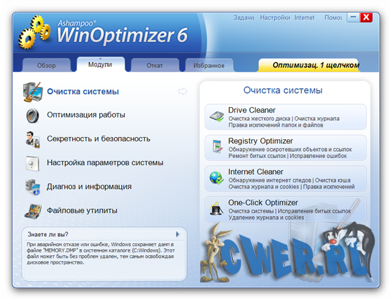 Удобная программа для оптимизации работы Windows. WinOptimizer залезет в самые труднодоступные уголки системы и прочистит их от не нужного мусора. Электронный чистильщик займется ненужными (или дублирующимися) файлами на жестком диске, удалит некорректные ключи из системного реестра, расчистит склад запылившихся файлов в во временном интернет-каталоге, настроит сетевые функции, а также проверит файловые ассоциации, настроит работу библиотек DLL и займется списком программ, загружающихся при запуске операционной системы - среди них тоже бывает много лишних.