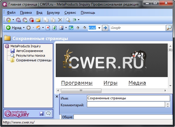 MetaProducts Inquiry позволяет быстро и просто сохранять веб-страницы целиком или некоторые их фрагменты. Открытые вами страницы сохраняются всего одним кликом. Программа имеет встроенный HTML-редактор, возможность поиска внутри сохраненных страниц и многое другое. Программа интегрируется в Internet Explorer, FireFox, Chrome, Opera, Safari, Netscape и Maxthon, а также имеет самостоятельное решение, позволяющее использовать его и в качестве браузера, и в качестве программы для сохранения страниц. В последних версиях добавлено подтверждение, когда страница сохраняется или, если страница с таким адресом уже есть в папке, диалог свойства папки, возможность изменения начальной страницы в браузере программы, возможность показывать последнюю открытую страницу при запуске.