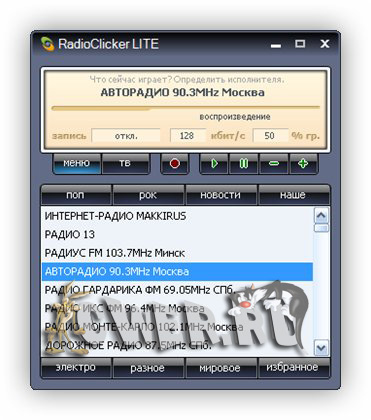 Программа предназначена для прослушивания РАДИО на компьютере через Интернет. В дополнении, с помощью RadioClicker можно просматривать русское интернет-телевидение. В программе собранны почти все РАДИО и ТВ каналы вещающие на русском языке. Среди популярных станций в списке программы можно выделить: «Русское радио», «Радио Шансон», «Радио Европа плюс», «Наше радио», «Радио Хит ФМ», «Радио 7 на семи холмах», «Радио Максимум», «Радио Эхо Москвы», «Радио D-FM», «Радио Ретро ФМ», «Радио NRJ», «Серебряный дождь», «Радио Дача», «Первый канал», «РТР-Планета», «телеканал Мир ТВ», «телеканал Вести», «телеканал РБК ТВ», «телеканал ЕвроСпорт Новости» и другие.
