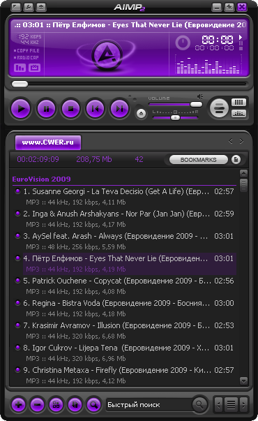 AIMP - это многофункциональный аудио центр. Благодаря встроенным утилитам, вы легко сможете перекодировать музыку из одного формата в другой, записать звук с микрофона или другого звукового устройства, отредактировать тэги музыкальных файлов, а так же группой переименовать или отсортировать их. AIMP2 базируется на известном аудио движке BASS - вы с легкостью можете подключить плагины от этой библиотеки к AIMP.AIMP - это отличный аудио плеер с поддержкой: скинов, многих музыкальных форматов и плюс, имеющий встроенные утилиты для работы со звуком. AIMP победил в «Софт года 2007» в номинациях «Интерфейс» и «Функциональность».