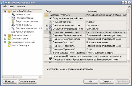 WireKeys - многофункциональная утилита, ориентированная на использование горячих клавиш. Вместе с WireKeys в системе появляются доп. буферы обмена (до 99), по каждому из которых (и по стандартному тоже) ведется история копирования, так что Вы всегда можете вставить то, что было в буфере "два копирования назад". Кроме этого появляются другие возможности по работе с выделенным текстом (например выделенный в любой программе текст можно запустить как из командной строки, посчитать как на калькуляторе, поменять раскладку текста, обработать VB/JScript макросом). Также удобно управлять списком активных процессов с возможностью мгновенно закрыть любой из них. Добавляются также широкие возможности по управлению открытыми окнами с клавиатуры: минимизация приложений в трей с сохранением главного меню программы (оно будет доступно в меню у иконки в трее), смена основных состояний окна нажатием на кнопки заголовка окна и т.д. Также есть часто необходимая возможность записать и воспроизвести последовательность нажатий клавиатуры или действий мыши, делать снимки экрана с автоматическим сохранением на диск и подписью, управлять различными медиа-плеерами и другими программами и многое другое. Возможности - неограничены!