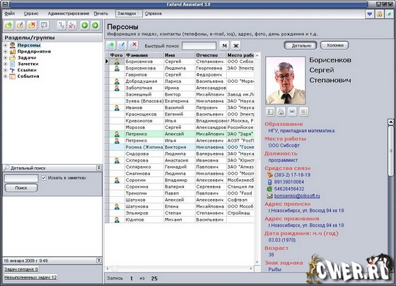 Электронный органайзер Exiland Assistant - это не просто планировщик задач или ежедневник. Кроме функций классического органайзера он может использоваться как база клиентов, программа CRM, программа записной книжки (pim) для хранения контактов людей и предприятий, заметок (статей, документов, хранения паролей, рецептов и т.п.), ссылок интернета, событий, праздников, юбилеев. Электронный ежедневник содержит удобный планировщик задач с напоминалкой.